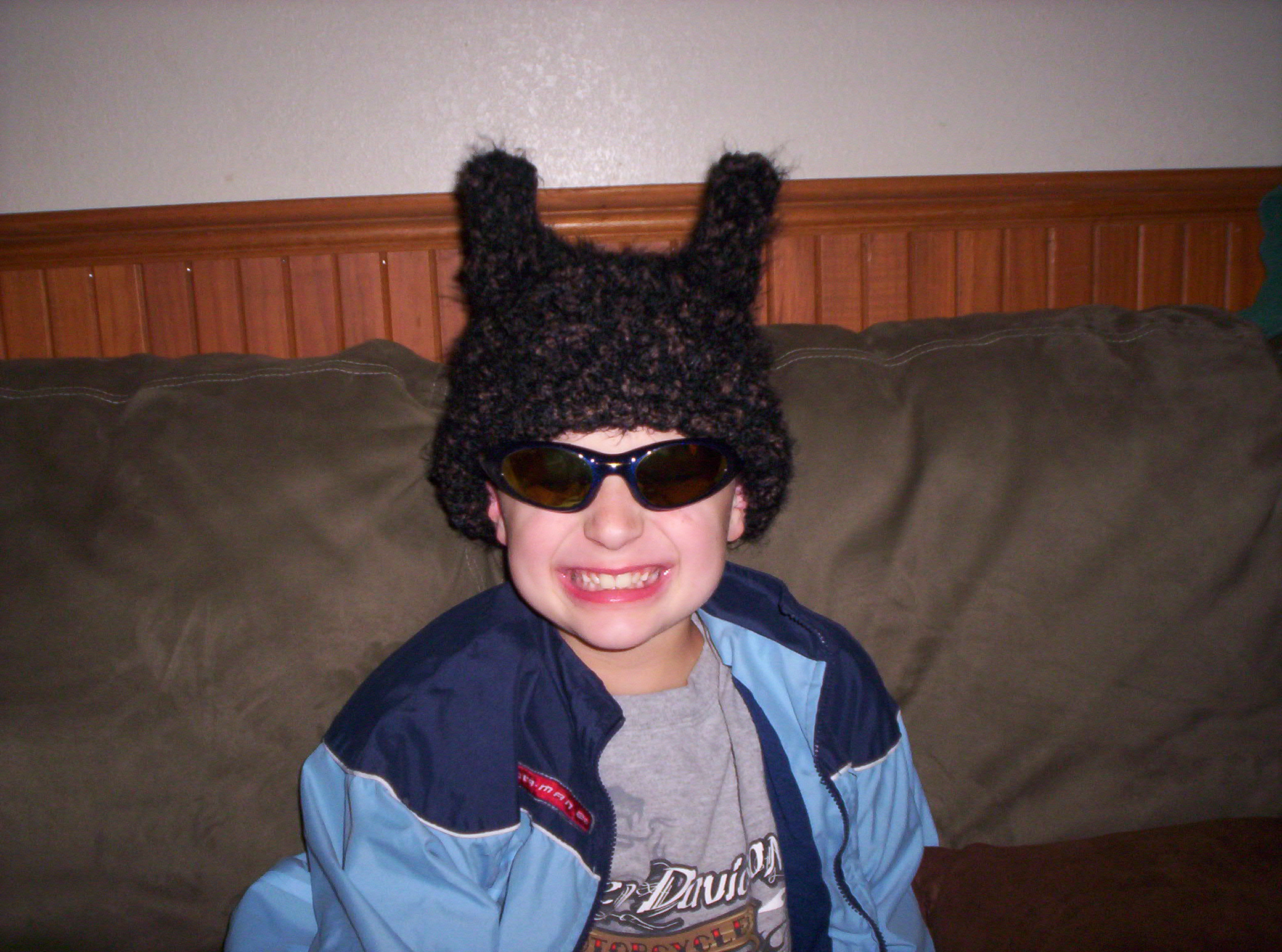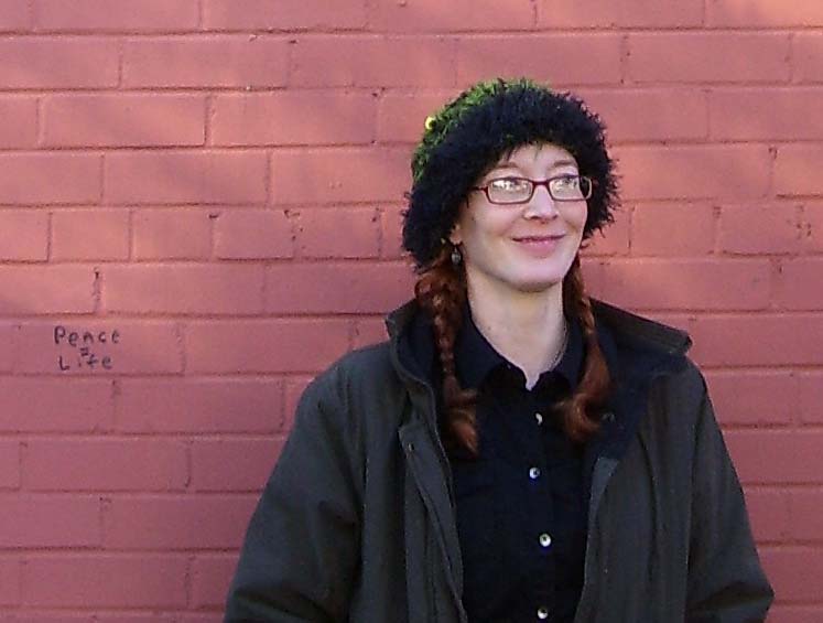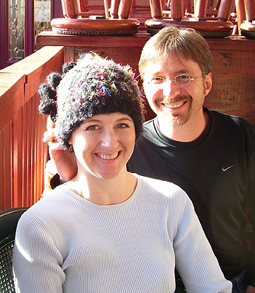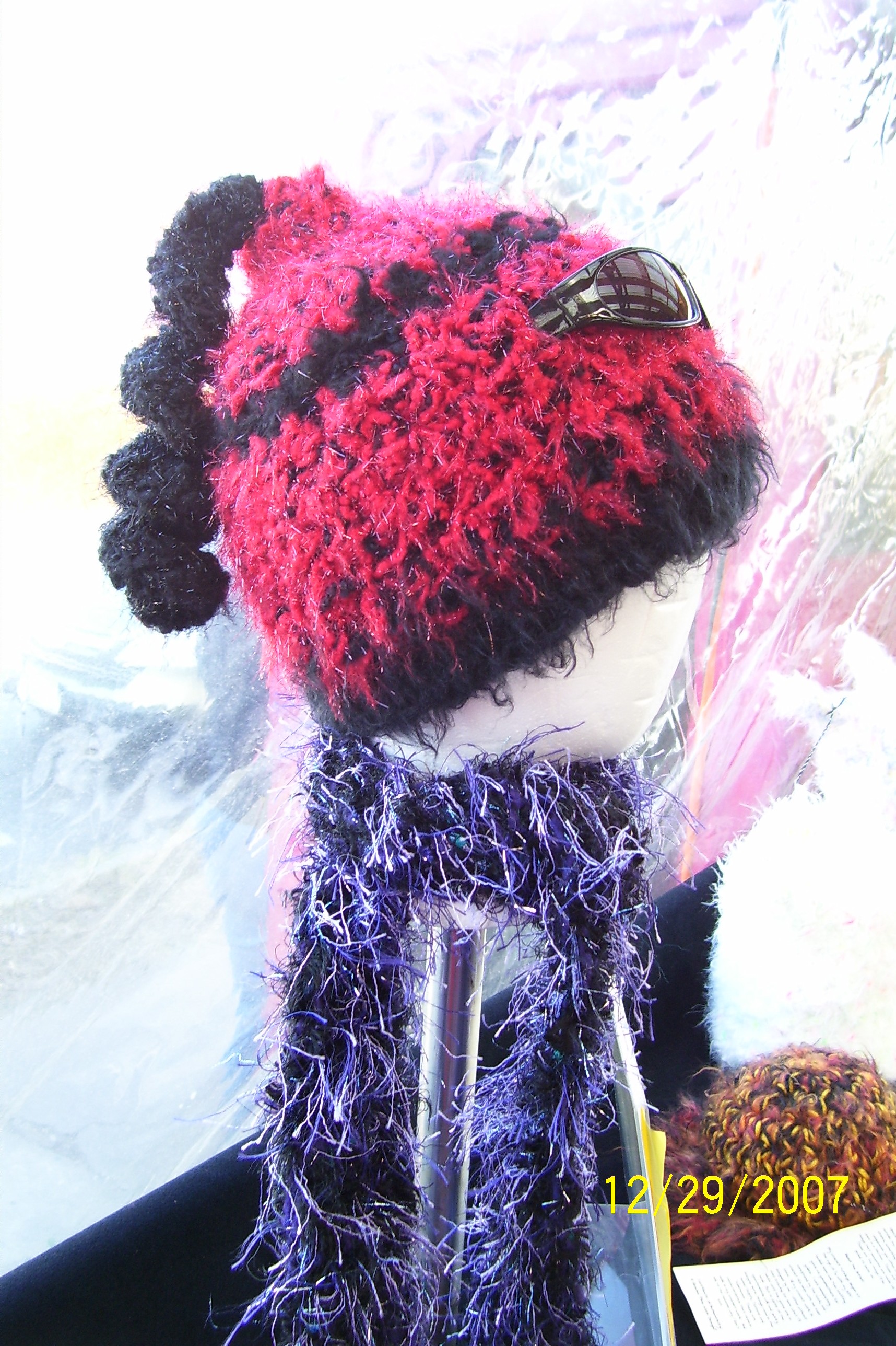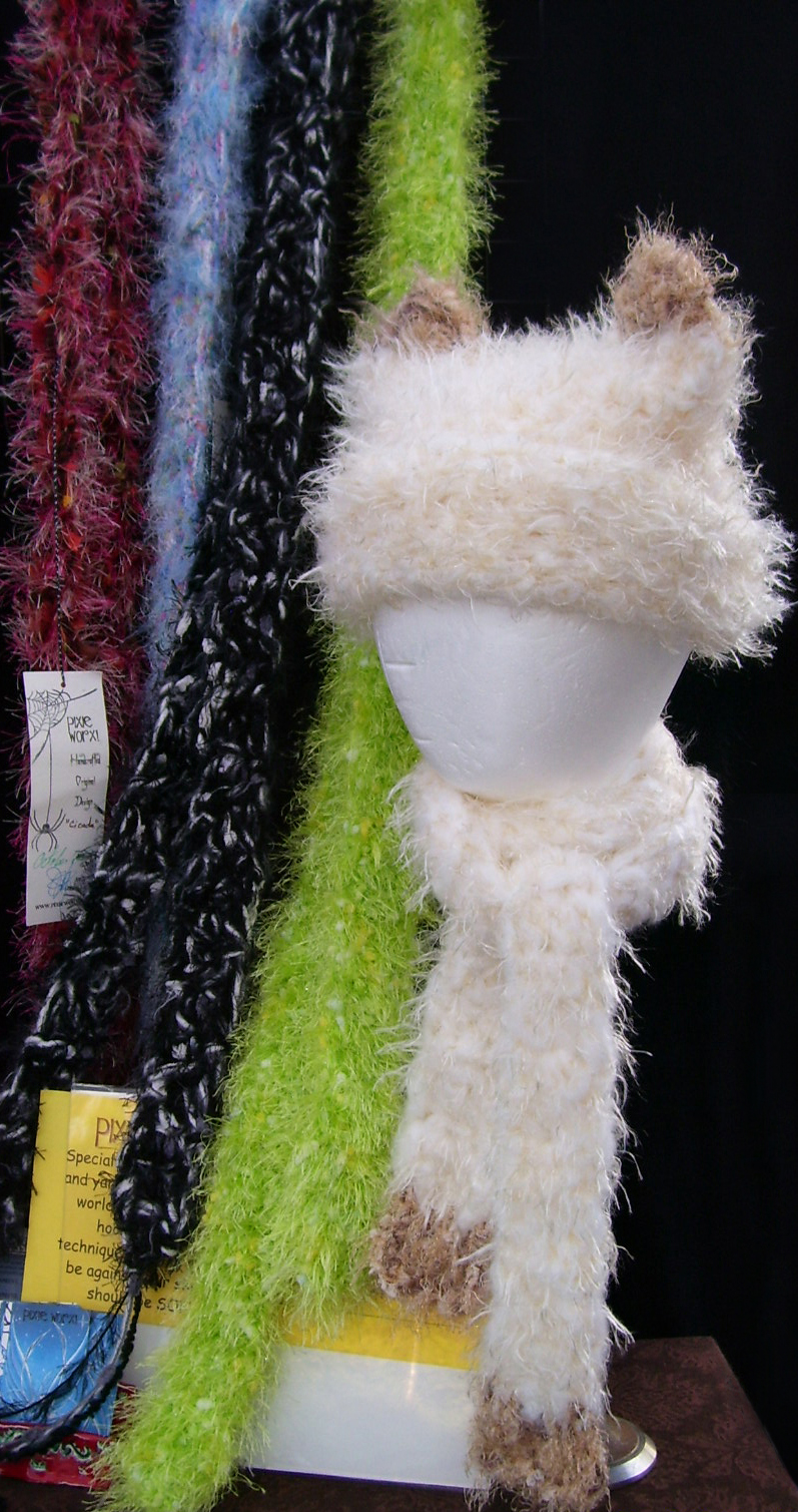 Dena and Chuck from Houston, TX were in Austin for a weekend get-away when they found The Artist's Market and Pixie Worx! Three hats and 24 hours later Dena is sporting her custom made squiggle hat, super soft black with rainbow influences! |